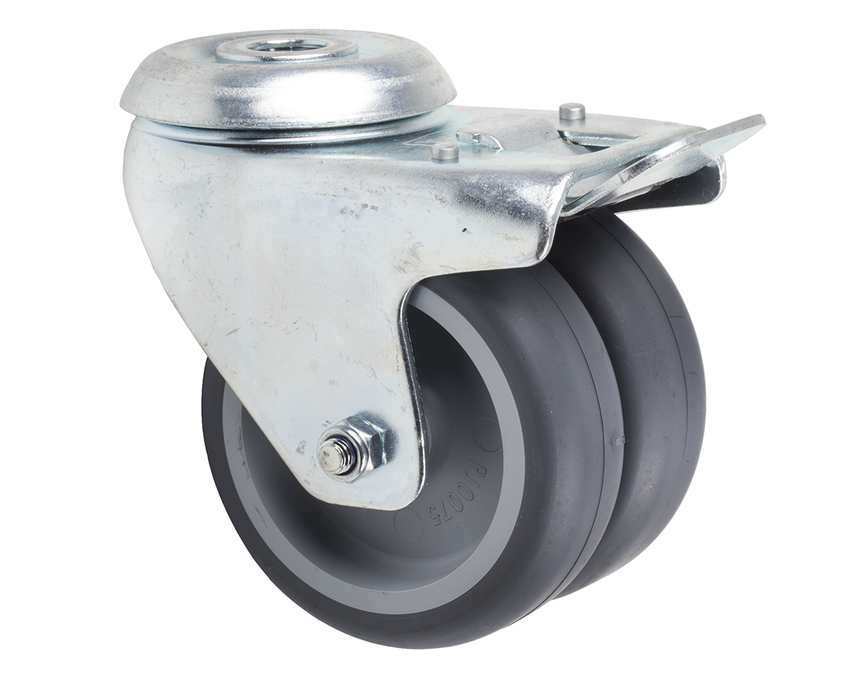 This is Stem Swivel Castors PP Rubber tyres manufactured by Tente. The manufacturer part number is 1977PJO075P30-13. The tyre of the product is made up of thermoplastic rubber material . It has approximately 12mm fixing hole size . The product is available in single bolt configuration. It includes brake yes . Moreover, it has 99mm of overall height. It can holds up to 80kg load capacity. It is created for light duty weight class . The product has a plain bearing type hub bearing . It has a wheel about 25mm in width . Its wheel diameter is about 75mm . Its hub is made using polypropylene material . Allows braked swivel rotation. Additionally, it includes 1 fixing holes .