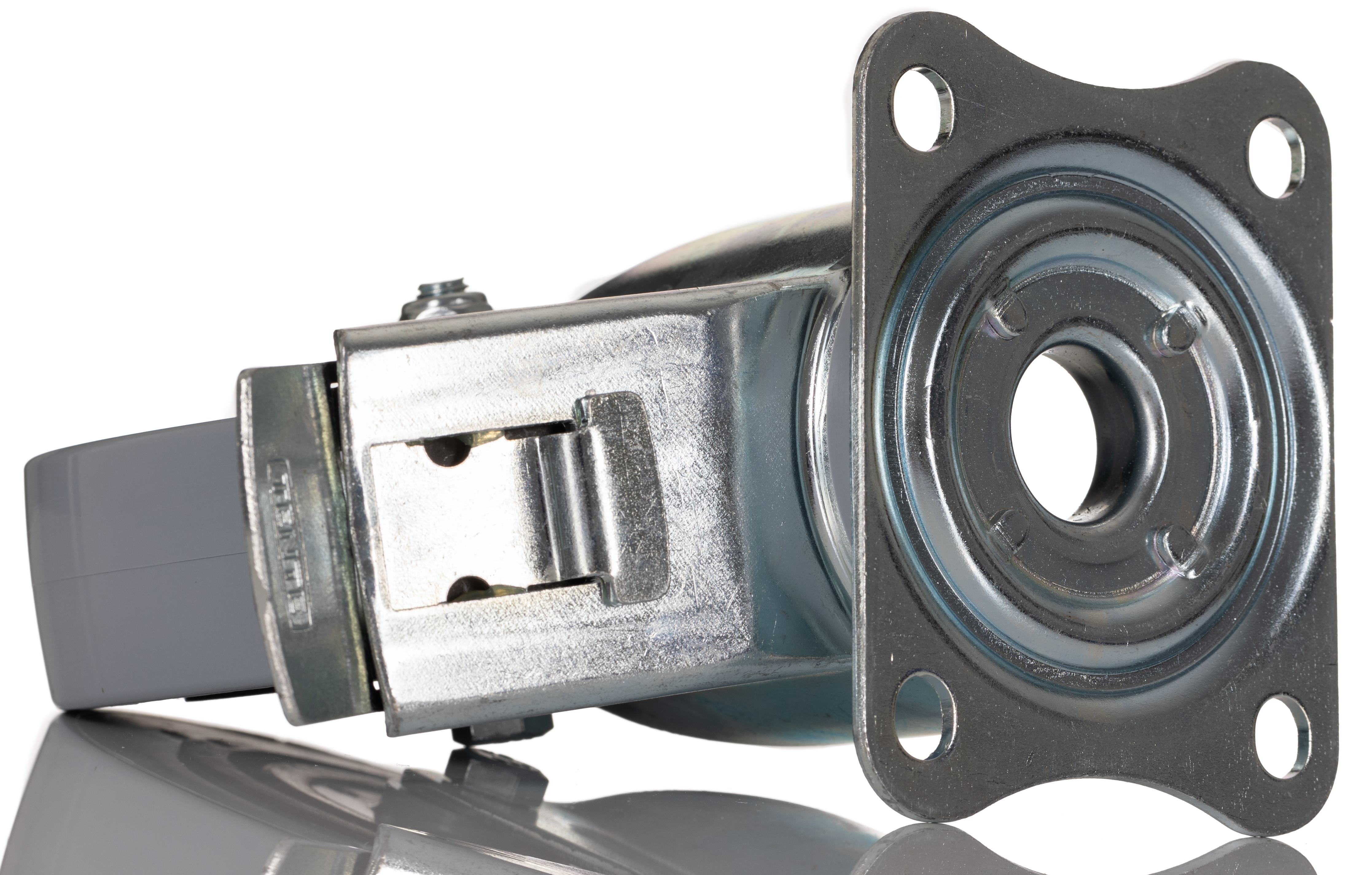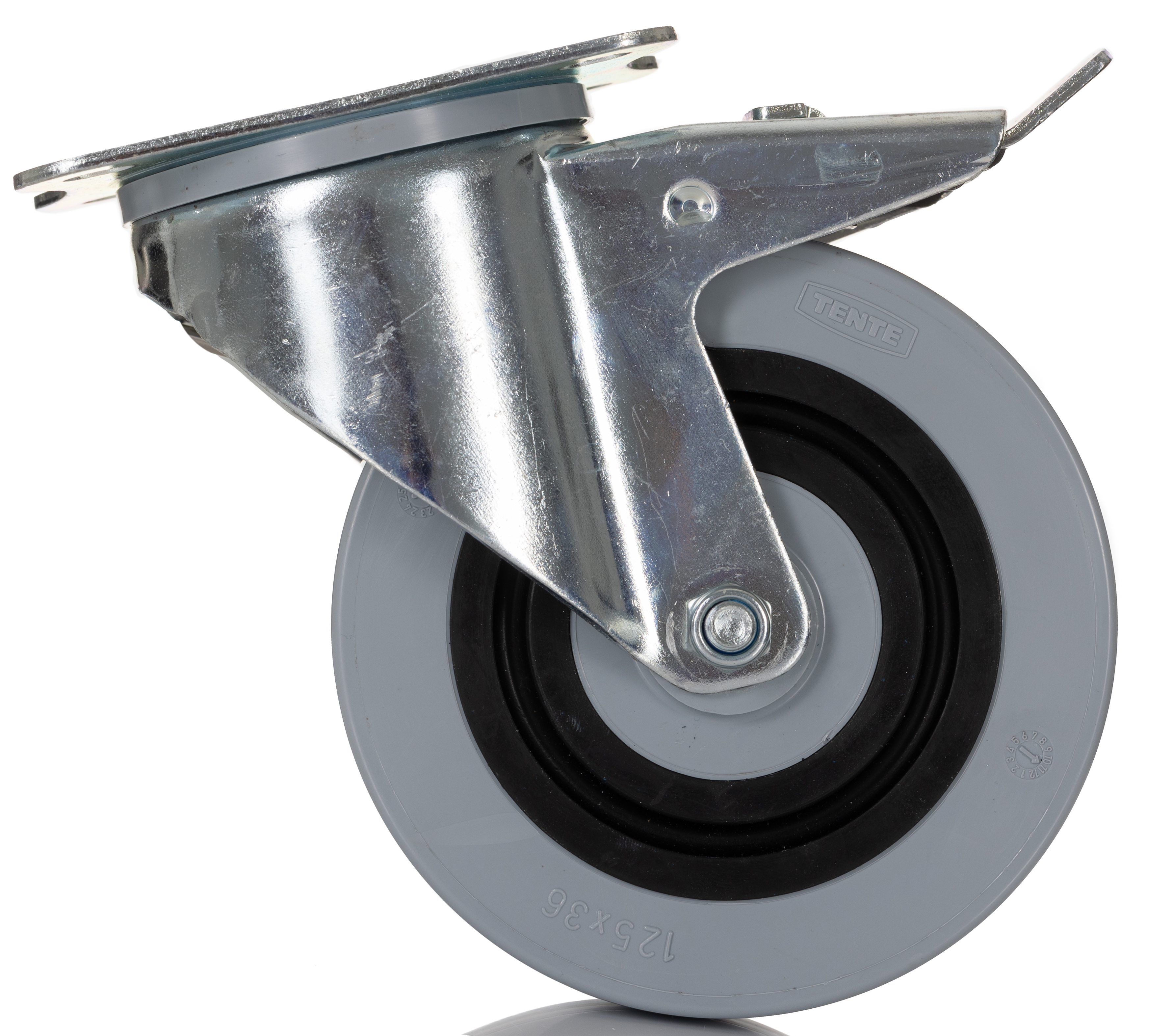 This is Swivel Plate Castor 400 (Static) kg 200 kg manufactured by Tente. The manufacturer part number is 3477HUR125P62 grey. The tyre of the product is made up of polyamide material . Moreover, its fixing plate dimensions are 105 x 85mm . It has approximately 9mm fixing hole size . The product is available in plate configuration. It includes brake yes . It has a typical 80 x 77 x 60mm fixing centres . Moreover, it has 155mm of overall height. It can holds up to 400kg load capacity. It is created for heavy duty weight class . The product has a roller bearing type hub bearing . It has a wheel about 36mm in width . Its wheel diameter is about 125mm . Its hub is made using polyamide material . Allows braked swivel rotation. Additionally, it includes 4 fixing holes .