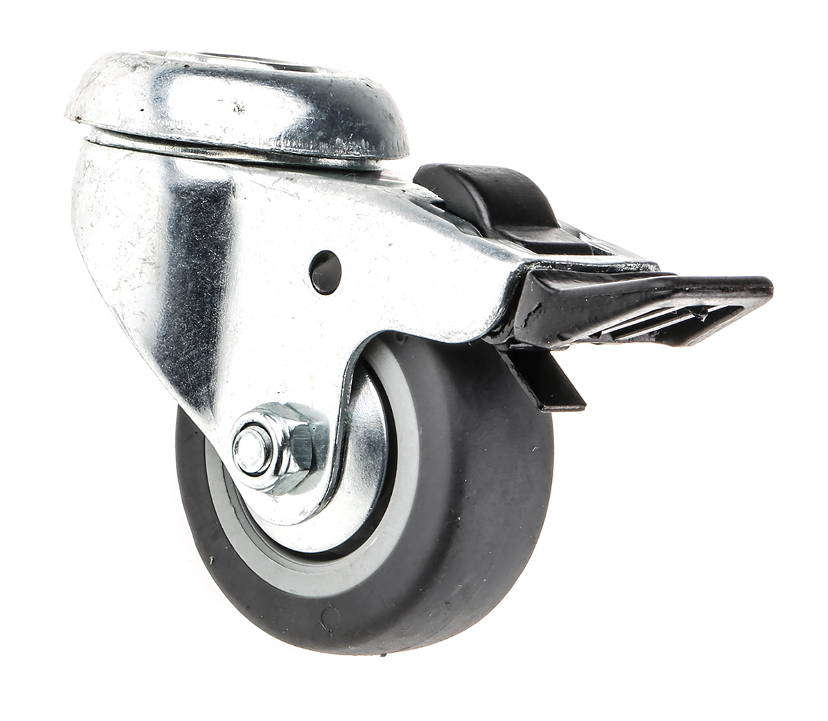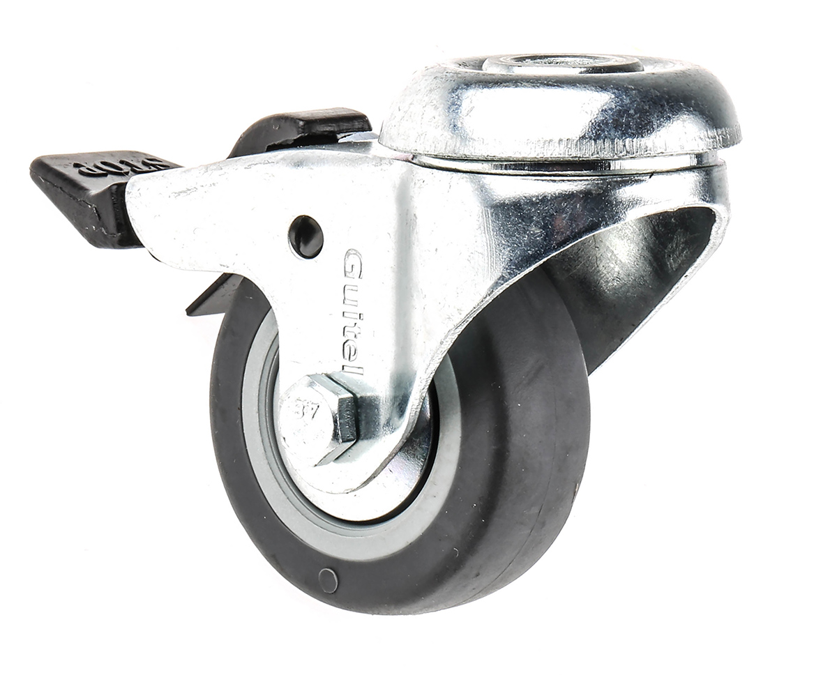 This is Swivel Castor Wheel 40daN Load Capacity 50mm Wheel Diameter manufactured by Guitel Hervieu. The manufacturer part number is 313322. The tyre of the product is made up of rubber material . It has approximately 10.5mm fixing hole size . The product is available in single bolt configuration. It includes brake yes . Moreover, it has 69mm of overall height. It can holds up to 40kg load capacity. The product also features robust zinc plated steel housing material. It is created for light duty weight class . The product has a plain bore type hub bearing . It has a wheel about 17mm in width . Its wheel diameter is about 50mm . Its hub is made using polypropylene material . Allows braked swivel rotation. Additionally, it includes 1 fixing holes .