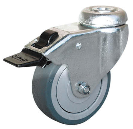 This is Swivel Castor Wheel 50kg Load Capacity 75mm Wheel Diameter manufactured by Guitel Hervieu. The manufacturer part number is 313722. The tyre of the product is made up of rubber material . It has approximately 10.5mm fixing hole size . The product is available in single bolt configuration. It includes brake yes . Moreover, it has 100mm of overall height. It can holds up to 60kg load capacity. The product also features robust galvanised steel housing material. It is created for light duty weight class . The product has a plain bore type hub bearing . It has a wheel about 24mm in width . Its wheel diameter is about 75mm . Its hub is made using polypropylene material . Allows braked swivel rotation. Additionally, it includes 1 fixing holes .