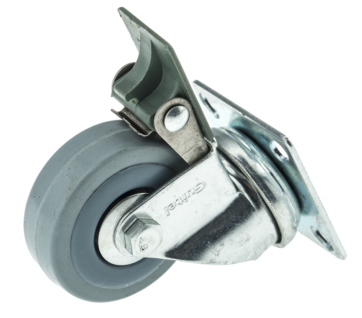 This is Braked Swivel Castor Wheel 40kg Load Capacity 50mm Wheel Diameter manufactured by Guitel Hervieu. The manufacturer part number is 66527. The tyre of the product is made up of rubber material . Moreover, its fixing plate dimensions are 50 x 50mm . It has approximately 6.5mm fixing hole size . The product is available in plate configuration. It includes brake yes . It has a typical 37.5 x 34mm fixing centres . Moreover, it has 72mm of overall height. It can holds up to 40kg load capacity. The product also features robust zinc plated steel housing material. It is created for light duty weight class . The product has a plain bore type hub bearing . It has a wheel about 18mm in width . Its wheel diameter is about 50mm . Its hub is made using polypropylene material . Allows braked swivel rotation. Additionally, it includes 4 fixing holes .
