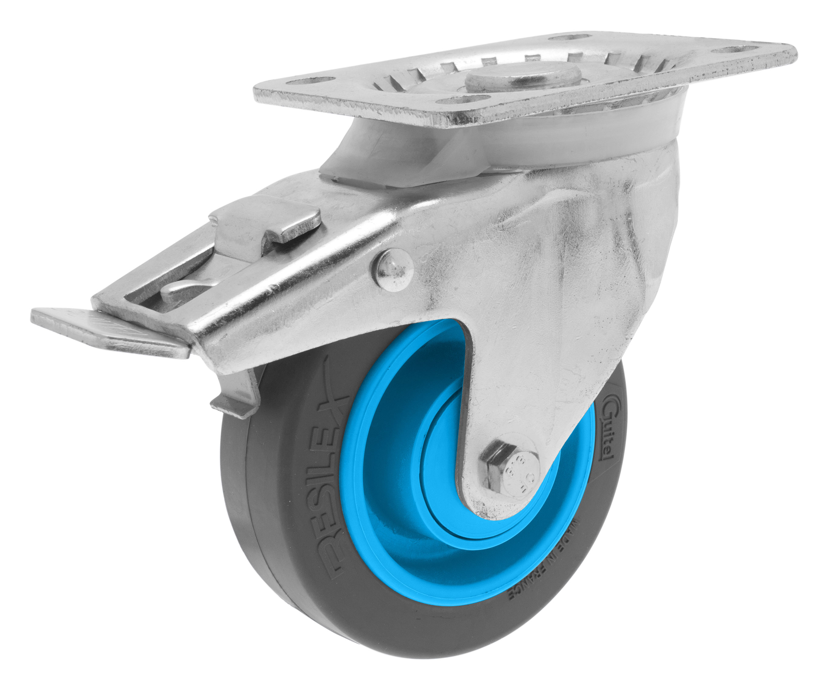 This is Braked Swivel Castor Wheel 200kg Load Capacity 100mm Wheel Diameter manufactured by Guitel Hervieu. The manufacturer part number is 374542. The tyre of the product is made up of elastic material . Moreover, its fixing plate dimensions are 105 x 80mm . It has approximately 8.5mm fixing hole size . The product is available in plate configuration. It includes brake yes . It has a typical 80 x 60mm fixing centres . Moreover, it has 132mm of overall height. It can holds up to 200kg load capacity. The product also features robust plastic housing material. It is created for heavy duty weight class . The product has a ball bearing type hub bearing . It has a wheel about 31mm in width . Its wheel diameter is about 100mm . Its hub is made using polyamide material . Allows braked swivel rotation. Additionally, it includes 4 fixing holes .