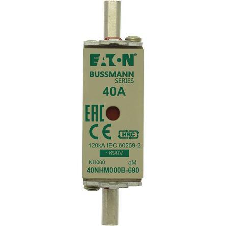 This is NH FUSE 40A 690V aM SIZE 000 manufactured by Cooper Bussmann. The manufacturer part number is 40NHM000B-690. The product has a am application category. The product has a current rating of 40 a. The fuse dimensions of the product is 41 x 21 x 49.7mm . Moreover, the product has a nominal 690 v ac voltage rating. The product nhm, is a highly preferred choice for users. A fuse with a 000 size. It has an overall length of 78.7mm. Its body length is 41mm. It integrates a nh fuse type. Its body height is 49.7mm. The fuse complies with din 43620, iec 60269 standards. Its overall body width is 21mm .