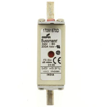 This is FUSE 200A 690V aR DIN 000 HSDNH manufactured by Cooper Bussmann. The manufacturer part number is 170M1570D. It has a blade type tag . The product has a ar application category. The product has a current rating of 200 a. The fuse dimensions of the product is 52 x 20.5 x 49.7mm . Moreover, the product has a nominal 690 v ac voltage rating. A fuse with a 000 size. It has an overall length of 78.5mm. Its tag is 15mm wide . Its body length is 52mm. It integrates a hsdi fuse type. Its body height is 49.7mm. The fuse complies with ce, csa, iec 60269, ul standards. The fuse has a robust t speed. Its overall body width is 20.5mm .