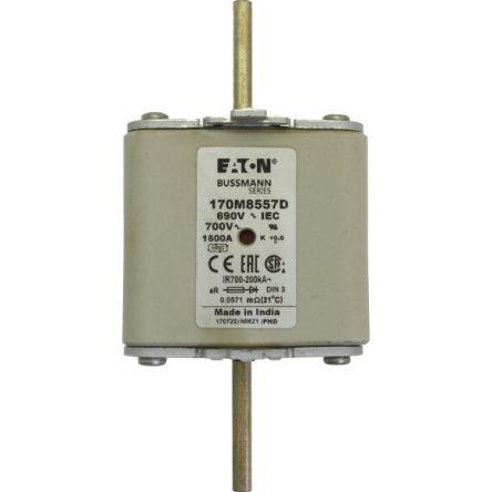 This is FUSE 1600A 690V aR DIN 3 HSDNH manufactured by Cooper Bussmann. The manufacturer part number is 170M8557D. It has a blade type tag . The product has a ar application category. The product has a current rating of 1.6 ka. The fuse dimensions of the product is 87 x 71 x 68mm . Moreover, the product has a nominal 690 v ac voltage rating. A fuse with a 3 size. It has an overall length of 150mm. Its tag is 32mm wide . Its body length is 87mm. It integrates a hsdi fuse type. Its body height is 68mm. The fuse complies with ce, csa, iec 60269, ul standards. Its overall body width is 71mm .