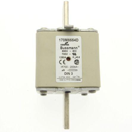 This is FUSE 1250A 690V aR DIN 3 HSDNH manufactured by Cooper Bussmann. The manufacturer part number is 170M8554D. It has a blade type tag . The product has a ar application category. The product has a current rating of 1.25 ka. The fuse dimensions of the product is 87 x 71 x 68mm . Moreover, the product has a nominal 690 v ac voltage rating. A fuse with a 3 size. It has an overall length of 150mm. Its tag is 32mm wide . Its body length is 87mm. It integrates a hsdi fuse type. Its body height is 68mm. The fuse complies with ce, csa, iec 60269, ul standards. Its overall body width is 71mm .