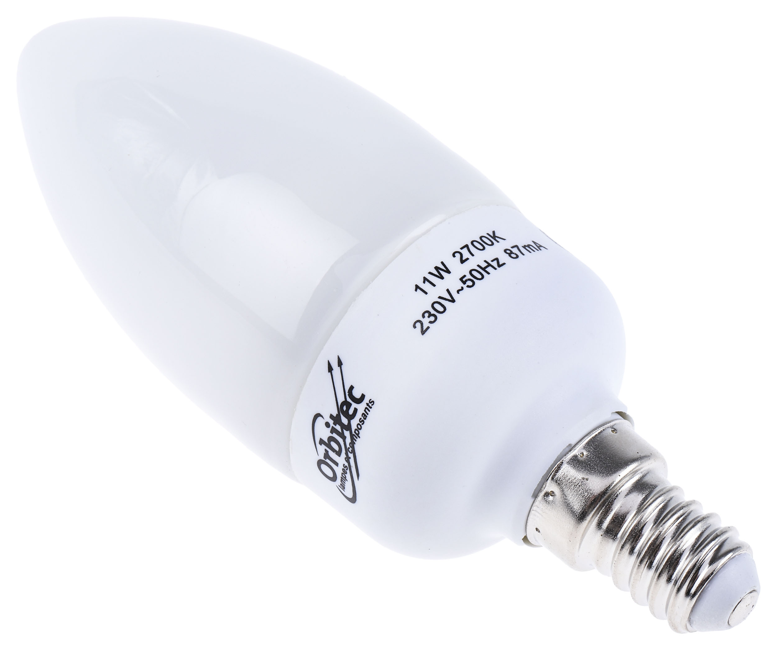 This is SES/E14 Candle Shape Retrofit Compact Fluorescent Bulbs 11 W 2700K manufactured by Orbitec. The manufacturer part number is 008840. Its diameter is 42mm. This integrates a colour temperature of 2700k. Moreover, the product has a nominal 230 v voltage rating. Features luminosity up to 535 lm. This product carries 11 w. It includes 827 colour reference . Its accurate length is 120 mm. In addition, it has about 60w incandescent equivalent wattage . The lamp base is e14. It is a candle product with unique specifications. It is dimmable no . It has about 80 colour rendering . Adding to this, it has a long life span for about 6000h. The tone of the colour includes warm white.