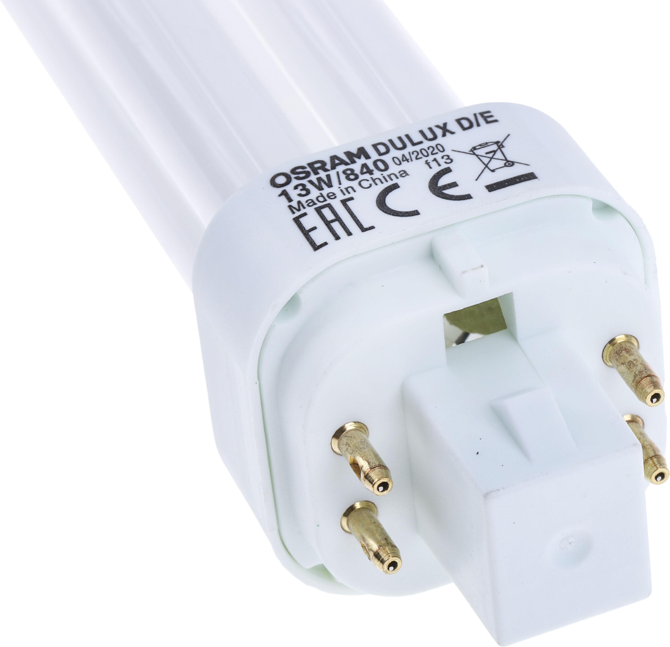 This is 4 Pin Non Integrated Compact Fluorescent Bulbs 13 W 4000K Cool White manufactured by Osram. The manufacturer part number is DDE134. Its diameter is 27mm. In addition, it has about 75w incandescent equivalent wattage . The product dulux, is a highly preferred choice for users. This product carries 13 w. It includes 840 colour reference . Its accurate length is 131 mm. It is rated with a EU energy efficiency. The lamp base is g24q-1. It is a quad tube product with unique specifications. This integrates a colour temperature of 4000k. It has about 80 colour rendering . Features luminosity up to 900 lm. It has 2 loops . Adding to this, it has a long life span for about 20000h. The tone of the colour includes cool white.