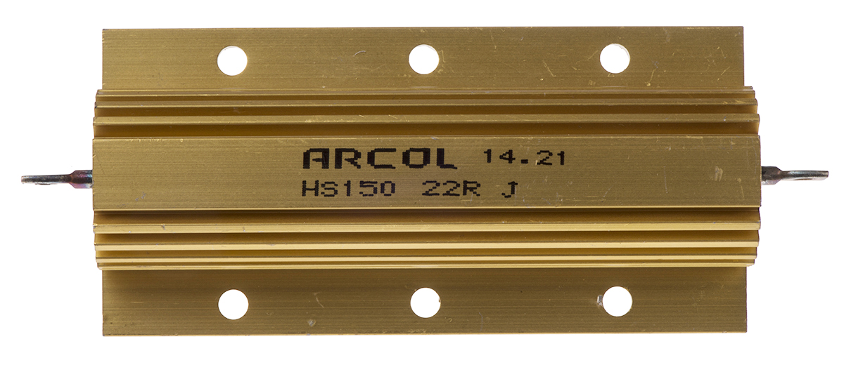 This is HS150 Series Aluminium Housed Axial Wire Wound Panel Mount Resistor 22Ω ±5% 150W manufactured by Arcol. The manufacturer part number is HS150 22R J. It features +100ppm/°c of maximum temperature coefficient. The given dimensions of the product include 24.1 x 121 x 47.5mm. The product hs150, is a highly preferred choice for users. It has an overall width of 47.5mm. Moreover, it has axial terminal style. It carries 22ω resistance. It has -100ppm/°c of minimum temperature coefficient. It features ±5% of tolerance value. It has an overall length of 121mm. Feature 150w of power rating. This product use wire wound technology. Moreover, it has 24.1mm of overall height. Concerning its package and casing, it is aluminium housed.