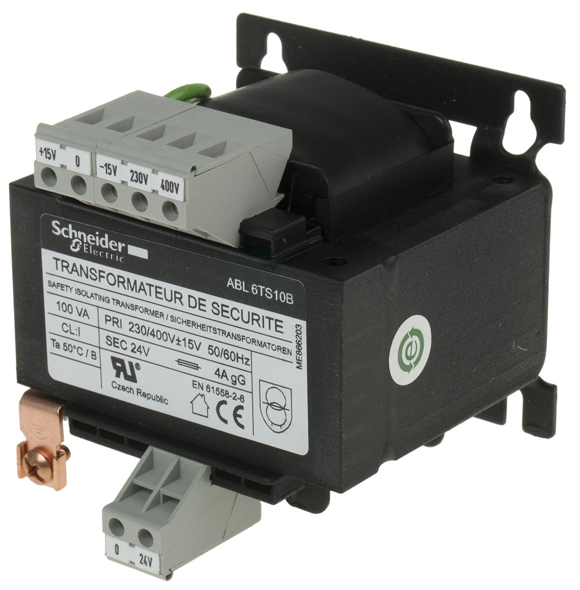 This is 100VA DIN Rail Panel Mount Transformer 230V ac 400V ac Primary 1 x 24V ac Secondary manufactured by Schneider Electric. The manufacturer part number is ABL6TS10B. Additionally, the product is supplied with 1 outputs. Better World Verification Options - green premium. The product has +50°c maximum temperature. The given dimensions of the product include 86 x 85 x 94mm. The typical product's weight is 2kg. In addition, it has a secondary 24v ac voltage rating . While its minimum temperature is -20°c. Its accurate length is 85mm. It carries 63hz of maximum operating frequency. Furthermore, the product is 85mm wide. The product comes in 94mm depth. Is it a better world product? yes. It has a minimum 47hz operating frequency . It has about 230 → 400v primary voltage rating . The product is available in chassis configuration. Feature 100va of power rating.