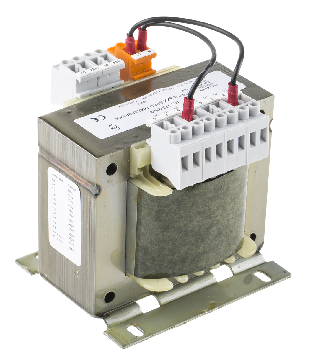 This is 400VA DIN Rail & Panel Mount Transformer manufactured by RS Pro. The manufacturer part number is 123-2502. Additionally, the product is supplied with 2 outputs. The product has (ambient) 70°c maximum temperature. The given dimensions of the product include 104 x 120 x 118mm. The typical product's weight is 5.3kg. It is a highly efficient product with an 90% of high efficiency. While its minimum temperature is -30°c. Its accurate length is 120mm. It carries 60hz of maximum operating frequency. The diameter of the fixing hole is 5.8 x 12mm. Furthermore, the product is 104mm wide. The product comes in 118mm depth. In addition, it has a secondary 2 x 115v ac voltage rating . It has a minimum 50hz operating frequency . It has about 208 v ac, 230 v ac, 380 v ac, 400 v ac, 415 v ac, 440 v ac, 460 v ac, 480 v ac, 500 v ac, 525 v ac, 550 v ac, 575 v ac, 600v ac primary voltage rating . The product is available in screw mount configuration. Feature 400va of power rating. The product complies with all safety standards, such as iec 61558-2-4.
