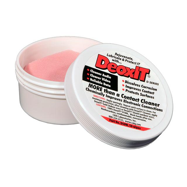This is manufactured by CAIG Laboratories, Inc.. The manufacturer part number is D50W. It is assigned with possible HTSUS value of 3402.50.5100. The product is rohs3 compliant. It comes in wipes configuration. In addition, it is reach unaffected. The product is widely employed in electronics. It offers storage features at 120°f (49°c). It is shipped in retail package package . Its typical moisture sensitivity level is 1 (unlimited). It has a long 5 weeks standard lead time. The product deoxit® d, is a highly preferred choice for users. The product is available in 44.45mm x 44.45mm size. The product is designated with the ear99 code number.