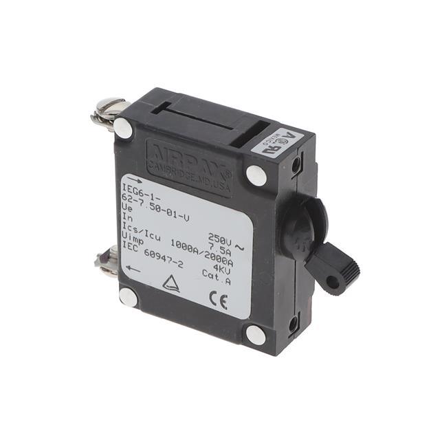 This is manufactured by Sensata-Airpax. The manufacturer part number is IEG6-1-62-7.50-01-V. It is assigned with possible HTSUS value of 8536.20.0020. The product is rohs compliant. It is approved by csa, tuv, ul1077. It is shipped in bulk package . It is a type of magnetic (hydraulic delay) breaker. It has a long 7 weeks standard lead time. Additionally, the product's output is 7.5a. Its typical moisture sensitivity level is 1 (unlimited). The product is available in panel mount configuration. The product ieg, is a highly preferred choice for users. The product carries lever actuator. It has equipped with 1 poles. Moreover, it corresponds to ieg6, a base product number of the product. The product is designated with the ear99 code number.