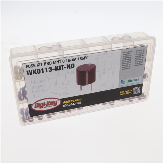 This is manufactured by Littelfuse Inc.. The manufacturer part number is WK0113-KIT. It is assigned with possible HTSUS value of 8536.10.0040. The product is rohs3 compliant. Moreover, the product has a nominal 250vac voltage rating. The product is also supplied with fuseholders. It responds within fast blow, slow blow. It is shipped in case package . Its typical moisture sensitivity level is 1 (unlimited). It also includes radial, can, vertical packages. Additionally, the product's output is 0.16 ~ 4a. Available in 170 pieces (17 values - 10 each) quantity. The board mount is designed to provide robust applications in a variety of specific settings. The product is available in through hole configuration. The product tr5® iec, is a highly preferred choice for users. The product is designated with the ear99 code number.