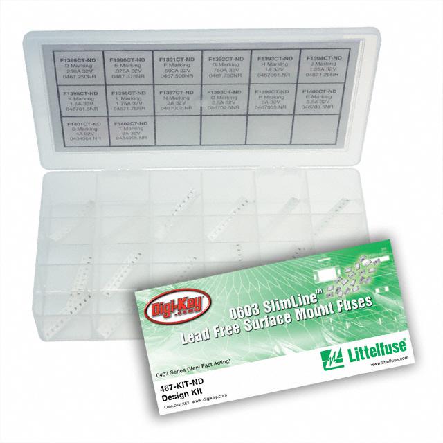 This is manufactured by Littelfuse Inc.. The manufacturer part number is 467-KIT. It is assigned with possible HTSUS value of 8536.10.0040. The product is rohs3 compliant. It responds within fast blow. The littelfuse inc.'s product offers user-desired applications. Moreover, the product has a nominal 32vac, 32vdc voltage rating. Its typical moisture sensitivity level is 1 (unlimited). It also includes 0603 (1608 metric) packages. Additionally, the product's output is 0.25 ~ 5a. Available in 140 pieces (14 values - 10 each) quantity. The board mount is designed to provide robust applications in a variety of specific settings. The product is available in surface mount configuration. The product 467, is a highly preferred choice for users. In addition, case is the available packaging type of the product. The product is designated with the ear99 code number.