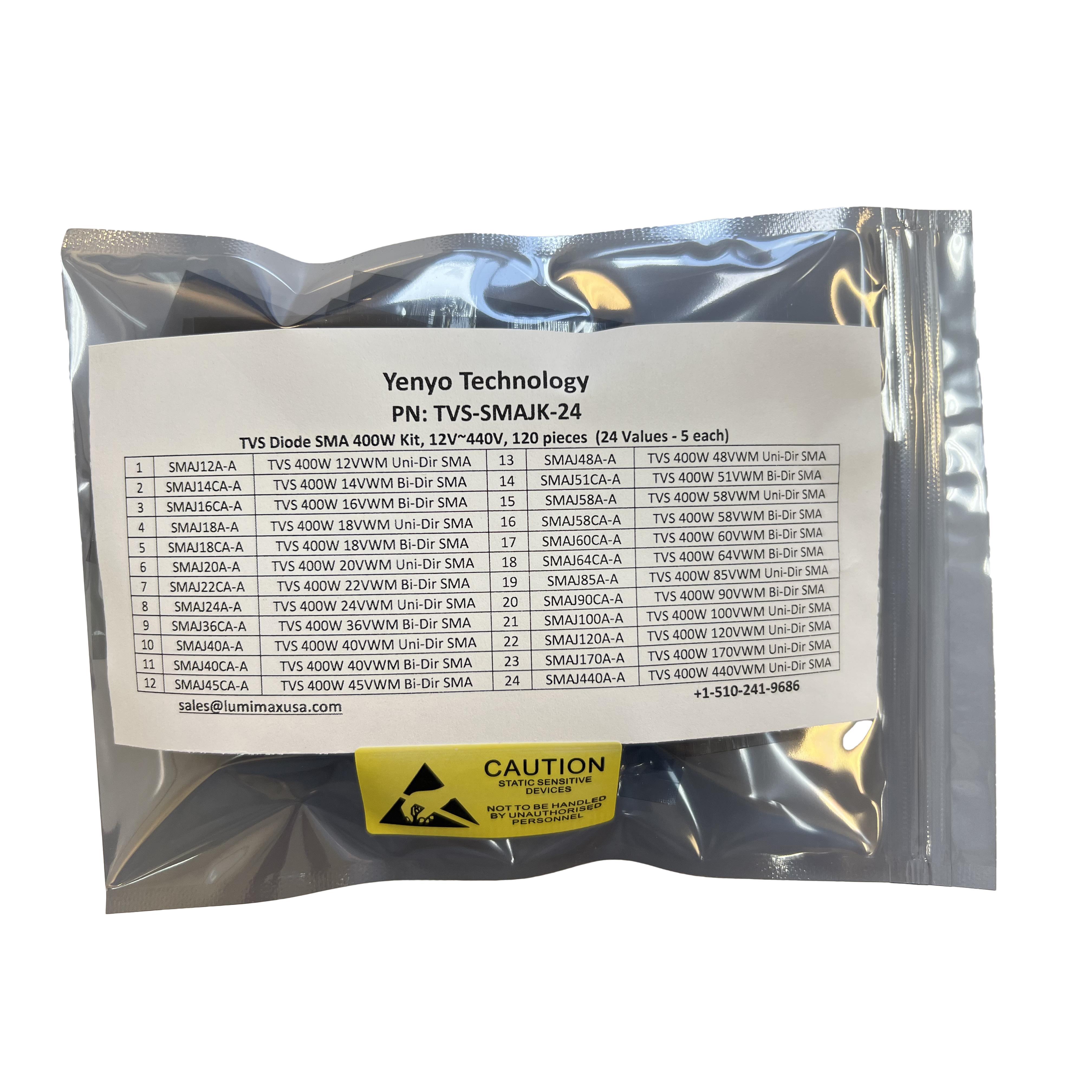 This is manufactured by Yenyo Technology. The manufacturer part number is TVS-SMAJK-24. The yenyo technology's product offers user-desired applications. The esd protection is designed to provide robust applications in a variety of specific settings. The product is available in surface mount configuration. It is assigned with possible HTSUS value of 8541.10.0080. The product is rohs compliant. In addition, it is reach unaffected. In addition, case is the available packaging type of the product. The nominal breakdown voltage of 12v ~ 440v. The product is designated with the ear99 code number. Available in 120 pieces (24 values - 5 each) quantity.