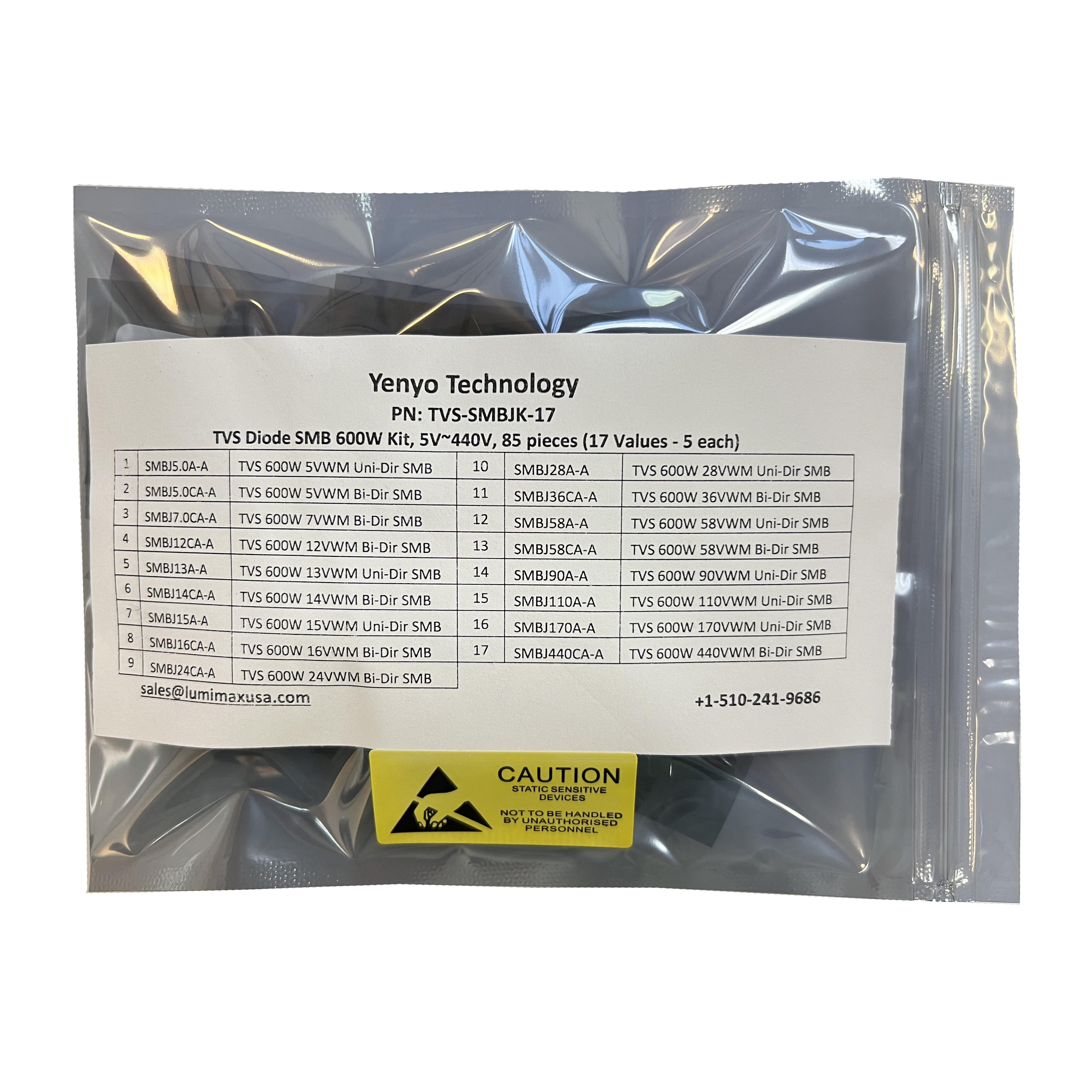 This is manufactured by Yenyo Technology. The manufacturer part number is TVS-SMBJK-17. The yenyo technology's product offers user-desired applications. The esd protection is designed to provide robust applications in a variety of specific settings. The product is available in surface mount configuration. It is assigned with possible HTSUS value of 8541.10.0080. The product is rohs compliant. In addition, it is reach unaffected. In addition, case is the available packaging type of the product. The nominal breakdown voltage of 5v ~ 440v. The product is designated with the ear99 code number. Available in 85 pieces (17 values - 5 each) quantity.