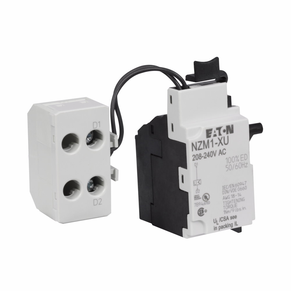 This is 208 <arrow/> 240 V ac Undervoltage Release Circuit Trip for use with N(S)1(-4) NZM1(-4) manufactured by Eaton. The manufacturer part number is 259442 NZM1-XU208-240AC. It has 240v ac control voltage . The product nzm1, is a highly preferred choice for users. Its sub type is undervoltage release . It features xboard range. The product is highly suitable for n(s)1(-4), nzm1(-4). circuit trip is a versatile product designed to provide user-defined applications. The terminal is a terminal block type.