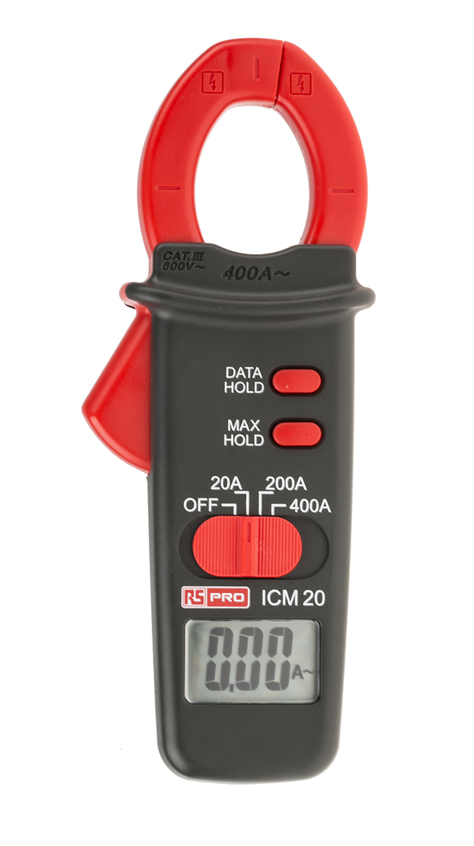This is ICM20 Clamp Meter Max Current 400A ac CAT III 600 V With RS Calibration manufactured by RS PRO. The manufacturer part number is 123-3422. The given dimensions of the product include 56 x 32 x 180mm. Moreover, the product gets power from battery. Moreover, it has a maximum 27 (dia.)mm size conductor . Furthermore, the product is 32mm wide. Its battery life is about 580 h . In addition, it has about 0.1a AC current measurement resolution . It has a model number icm20. It has an absolute maximum 400a ac current measurement . This 9v, iec 6f22, neda 1604 battery is comparatively much efficient than common batteries. It has a maximum operating temperature of +50°c. Moreover, its safety category level is cat iii . Its accurate length is 56mm. It is calibrated rscal . It features a remarkable lcd display. The product has about 31mm jaw busbars capacity . The typical product's weight is 250g. It has a ±2% ± 0.5a best AC current accuracy . Its safety category voltage is 600v . In addition, the height is 180mm. It provides robust safety and is complied with cat iii 600 v safety category. Whereas, the minimum operating temperature of the product is 0°c. It has a/an ac current clamp meter type clamp meter . Moreover, it has an ac current, continuity, diode test functions measured .