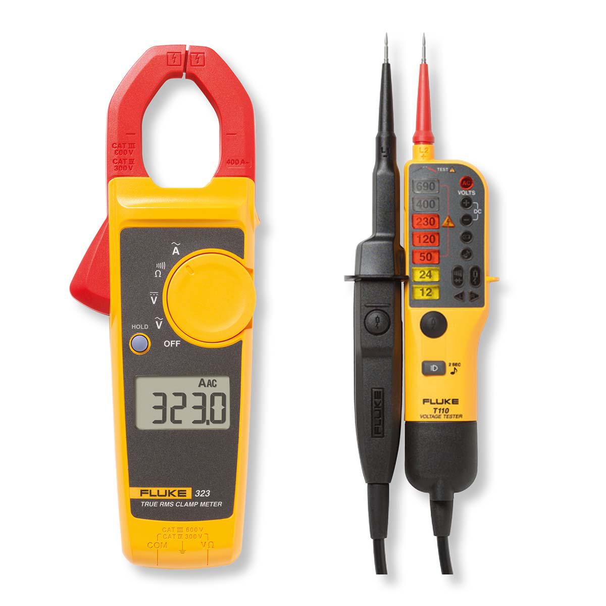 This is Clamp Meter Bundle CAT III 600 V CAT IV 300 V manufactured by Fluke. The manufacturer part number is 323/T110. It has a model number 323/t110. The AC Current Measurement Range of the product is 400 a It provides robust safety and is complied with cat iii 600 v, cat iv 300v safety category. It has an absolute maximum 400a ac current measurement . It has a/an ac-dc clamp meter-voltage tester type clamp meter .
