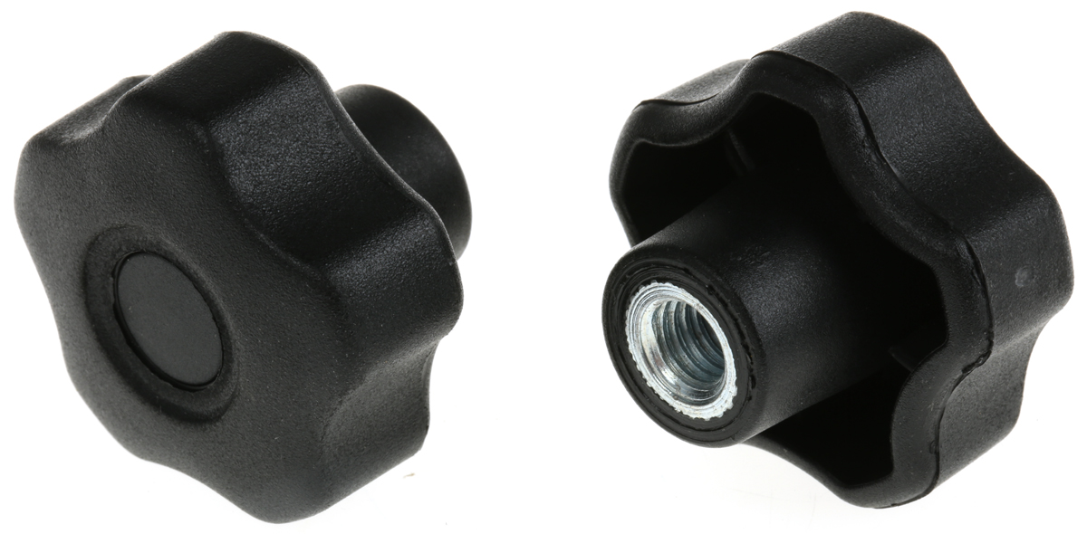 This is Black Thermoplastic Knob M8 x 12 manufactured by RS Pro. The manufacturer part number is 702-7598. Its overall knob diameter is about 40mm . It has a standard m8 thread . The product is available in threaded hole configuration. The product has an attractive multiple lobes shape knob . It has a decent black colour. It has a standard 8mm thread diameter . Features a thread length of 12mm. While it is also supplied with highly stable steel insert material.
