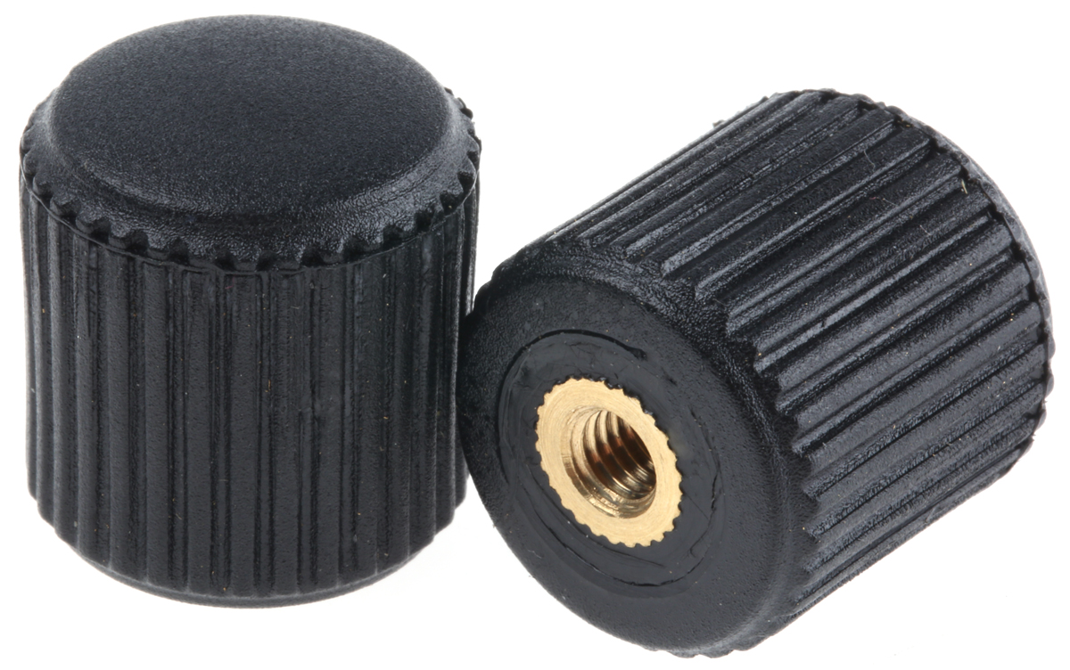 This is Black Thermoplastic Knob 685P manufactured by RS Pro. The manufacturer part number is 631-9108. Its overall knob diameter is about 20mm . It has a standard m5 thread . The product is available in threaded hole configuration. The product has an attractive knurled shape knob . It has a decent black colour. It has a standard 5mm thread diameter . While it is also supplied with highly stable brass insert material.