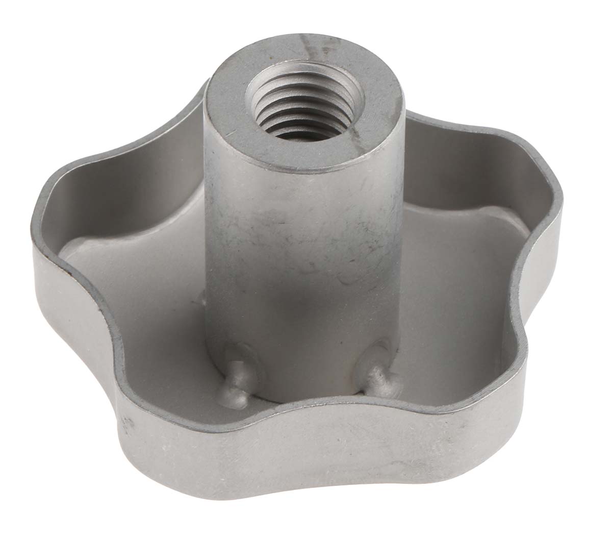 This is Silver Stainless Steel Knob M10 x 17.5 manufactured by RS Pro. The manufacturer part number is 478-624. Its overall knob diameter is about 50mm . It has a standard m10 thread . The product is available in threaded hole configuration. The product has an attractive multiple lobes shape knob . It has a decent silver colour. Features a thread length of 17.5mm. It has a standard 10mm thread diameter .