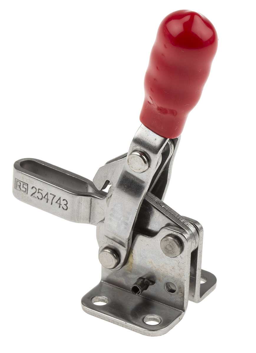 This is 130 → 195° Vertical Toggle Clamp manufactured by RS Pro. The manufacturer part number is 254-743. Equipped with a 120° jaw opening. The typical product's weight is 90g. It comes in vertical toggle clamp configuration. It has about 750n operating tension .
