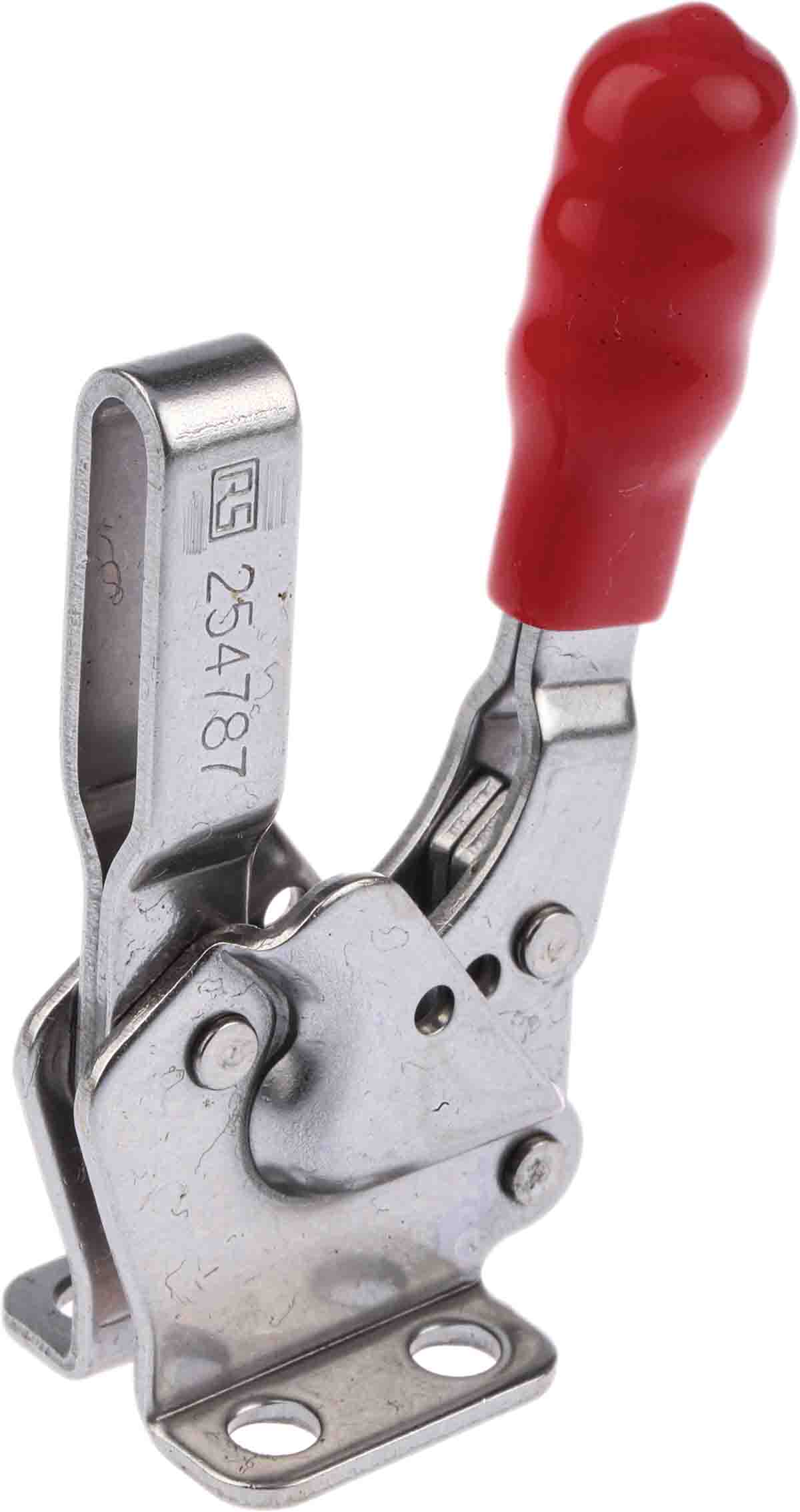 This is 90° x 25.4mm Horizontal Toggle Clamp manufactured by RS Pro. The manufacturer part number is 254-787. Equipped with a 94° jaw opening. The typical product's weight is 100g. It comes in horizontal toggle clamp configuration. It has about 750n operating tension .