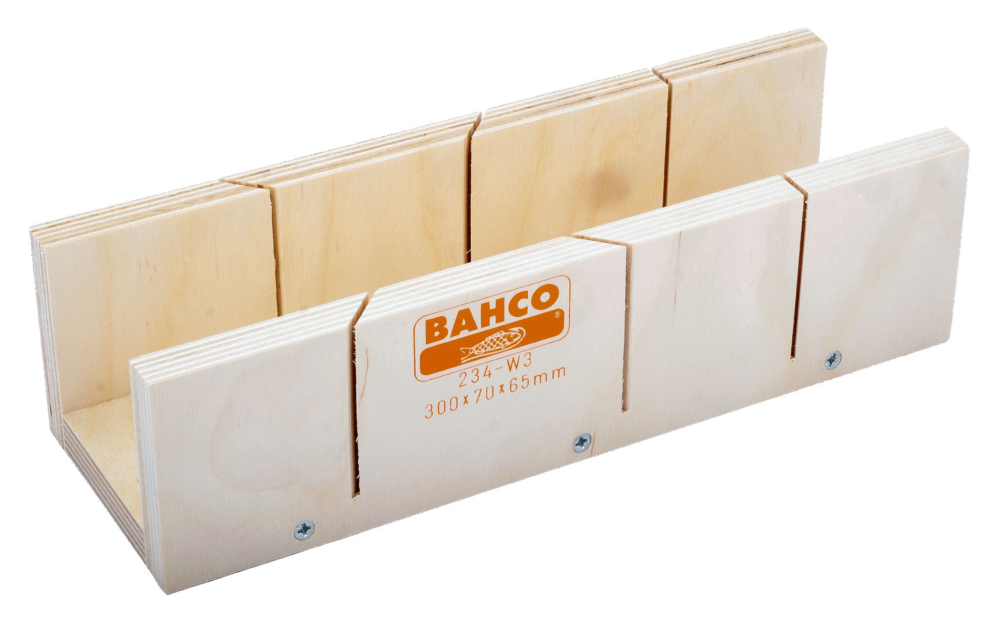 This is 80mm x 100mm Mitre Box manufactured by Bahco. The manufacturer part number is 234-W3. It comes in wooden mitre box with side wall configuration. The typical product's weight is 500g. The product consists of 1 pieces.