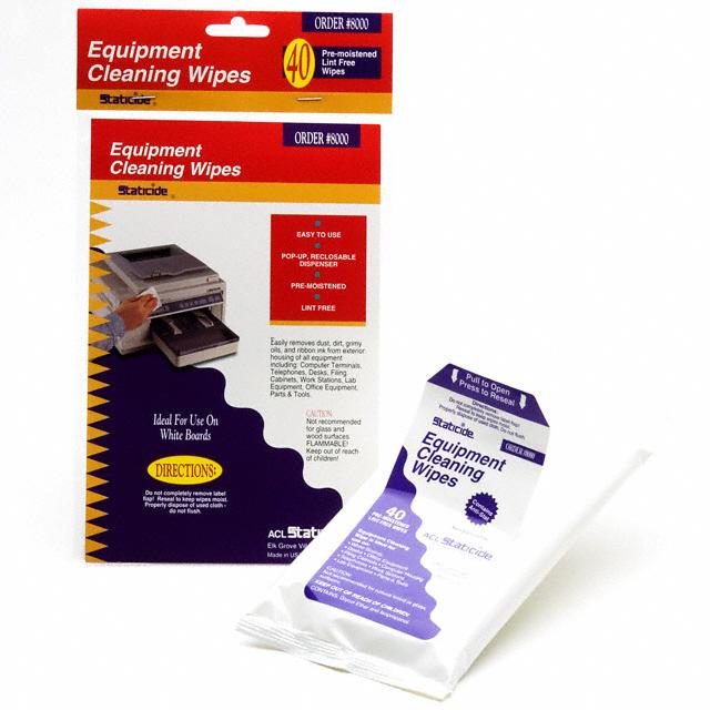 This is manufactured by ACL Staticide Inc. The manufacturer part number is 8000. The acl staticide inc's product offers user-desired applications. It is assigned with possible HTSUS value of 3401.19.0000. The product staticide®, is a highly preferred choice for users. In addition, it is reach unaffected. Specifications include lint free, plastic safe. In addition, bag is the available packaging type of the product. The product's typical Applications include uses in electronic equipment. Its typical moisture sensitivity level is not applicable. The product is designated with the ear99 code number. The product type and treatment include wipes, antistatic. Available in 40 (7" l x 7" w) quantity.
