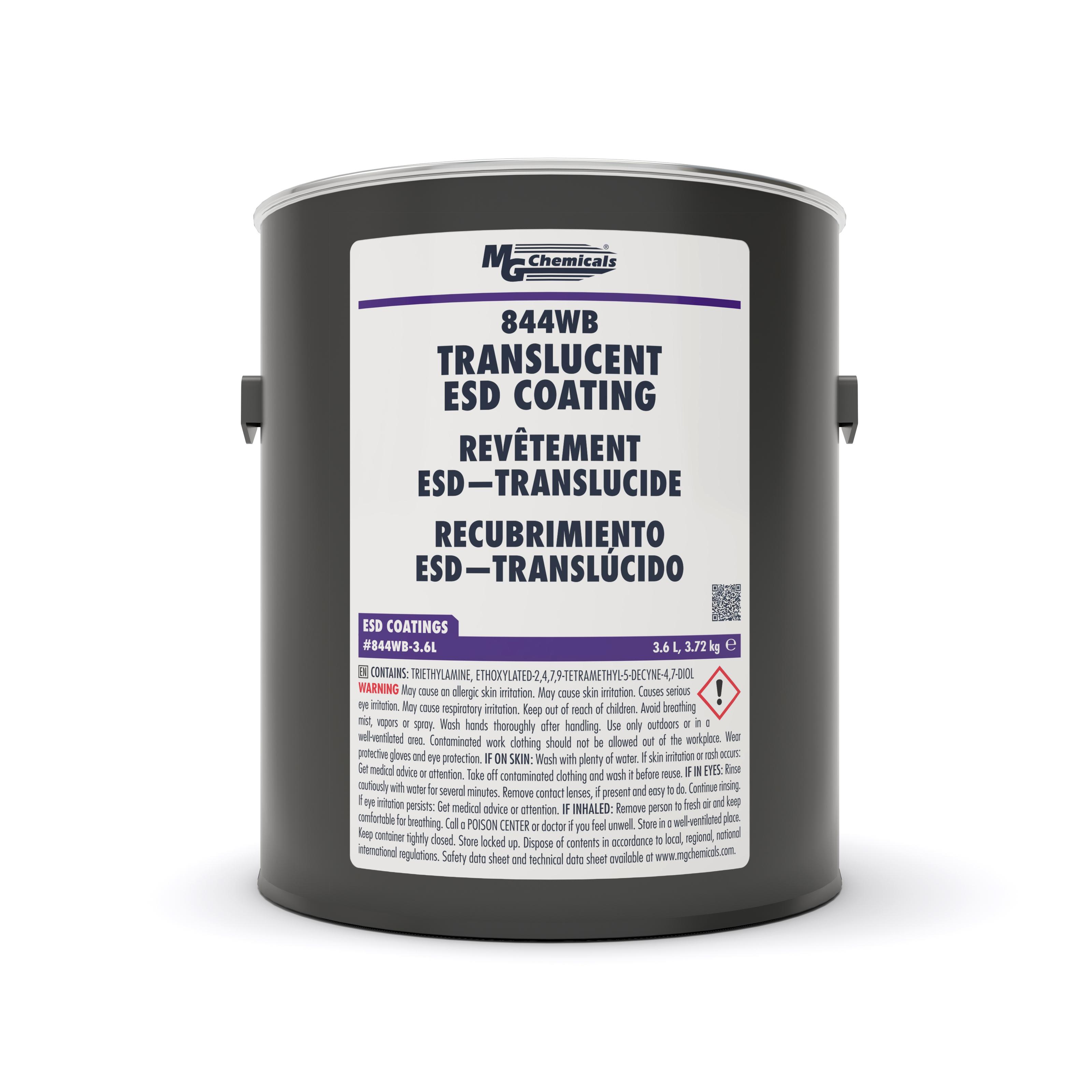 This is manufactured by MG Chemicals. The manufacturer part number is 844WB-3.6L. It is assigned with possible HTSUS value of 3209.90.0000. The product is rohs3 compliant. The product's typical Applications include uses in multiple surfaces. The product is highly reliable with a long-lasting period of 24 months. Specifications include dissipative, low voc. In addition, it is reach unaffected. Its warranty starts from date of manufacture. It offers storage features at 50°f ~ 86°f (10°c ~ 30°c). It is shipped in bulk package . Its typical moisture sensitivity level is not applicable. It has a long 2 weeks standard lead time. Available in 1 gallon quantity. The product 844wb, is a highly preferred choice for users. The product type and treatment include coating, antistatic. The product is designated with the ear99 code number.