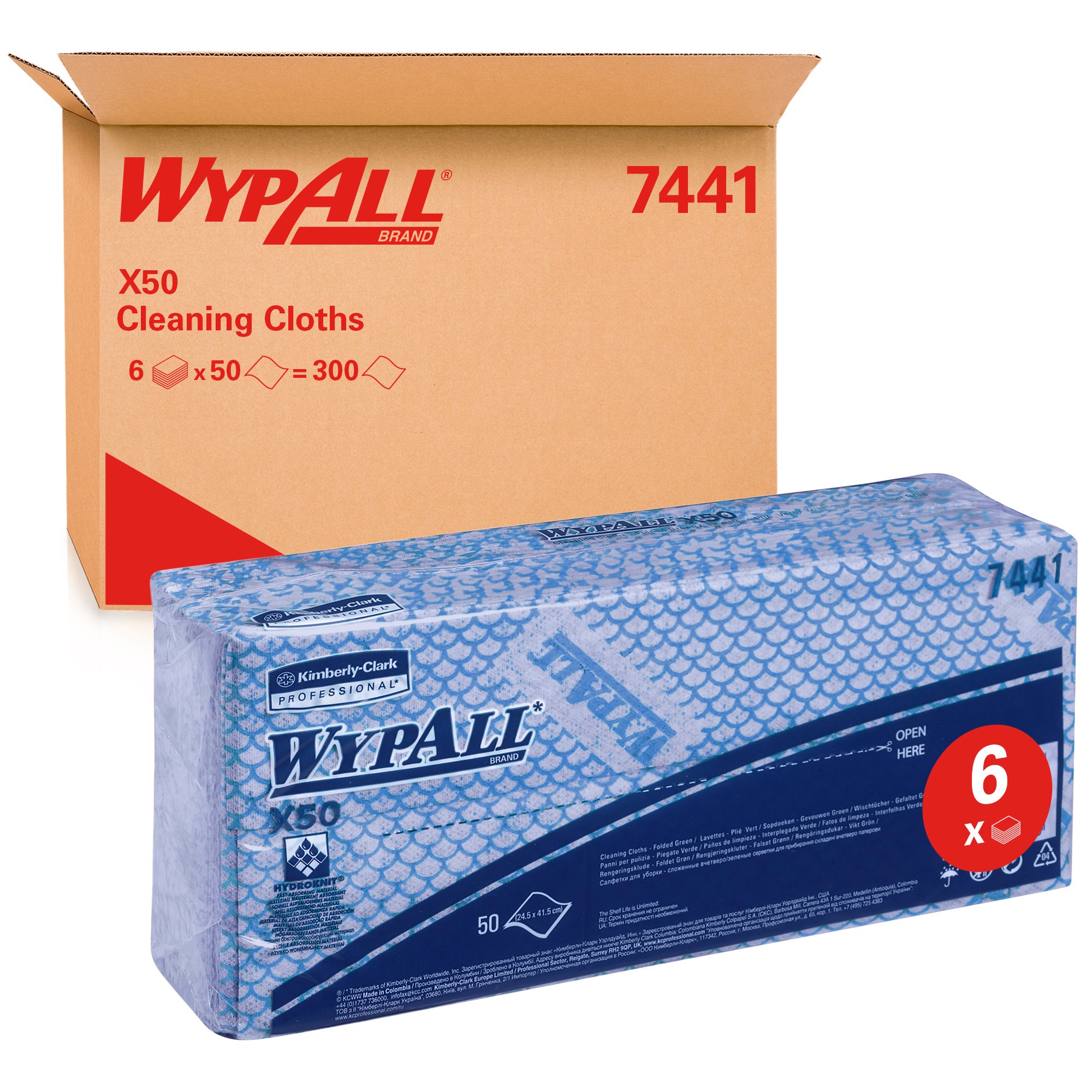 This is Bag of 50 Blue WYPALL X50 Cloths for Light Duty Cleaning Use manufactured by Kimberly Clark. The manufacturer part number is 7441. It is assigned with a trade name of wypall® x50 critical clean™ 7441. It is designed for repeat use . Applications Information involves surface cleaning. It has a decent blue colour. It has 1 ply . It is dry . It features x50 range. The package is a sort of box. Its wiper is 418 x 221mm in size . It contains 50 wipes per pack . It is tailored with high absorbency cloth features .