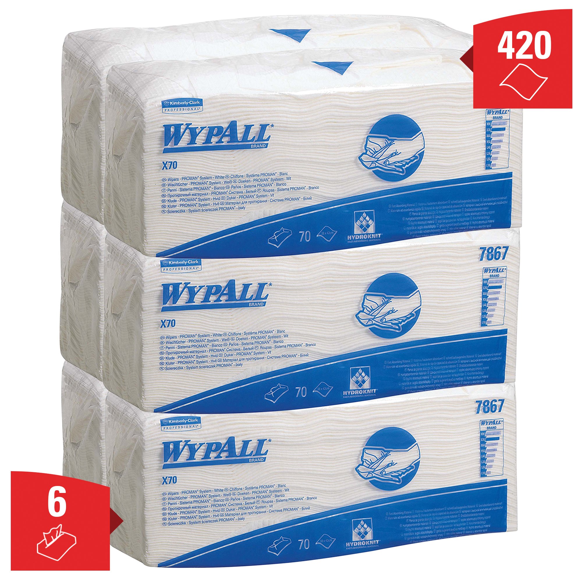 This is WYPALL X70 Cloths PROMAN System White manufactured by Kimberly Clark. The manufacturer part number is 7867. It is assigned with a trade name of wypall. It is designed for repeat use . Applications Information involves industrial cleaning. It has a decent white colour. It has 1 ply . It is wet . It features x70 range. The package is a sort of bag. Its wiper is 380 x 420mm in size . It contains 70 wipes per pack .