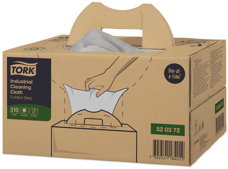 This is 210 Grey Non Woven Fabric Cloths for use with Industrial Cleaning manufactured by Tork. The manufacturer part number is 520372. It is assigned with a trade name of tork. Better World Verification Options - fsc certified. Is it a better world product? yes. It is designed for repeat use . Its cloth material is made up of non woven fabric . It has a decent grey colour. It has 1 ply . Applications Information involves industrial cleaning. It features tork cleaning cloth range. The package is a sort of box. Its wiper is 415 x 355mm in size . It contains 210 wipes per pack . It is tailored with soft cloth features .