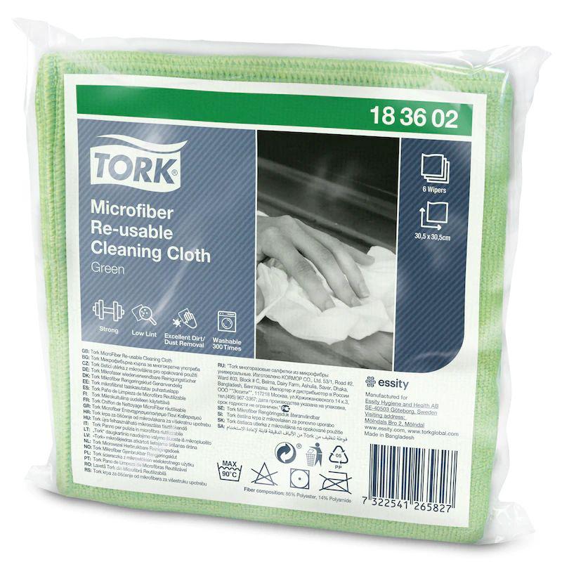 This is 6 Green Microfibre Cloths for use with Cleaning manufactured by Tork. The manufacturer part number is 183602. It is assigned with a trade name of tork. Its cloth material is made up of microfibre . It has a decent green colour. Applications Information involves cleaning. It features tork range. The package is a sort of plastic. It contains 6 wipes per pack . It is tailored with microfiber reusable cloth features .
