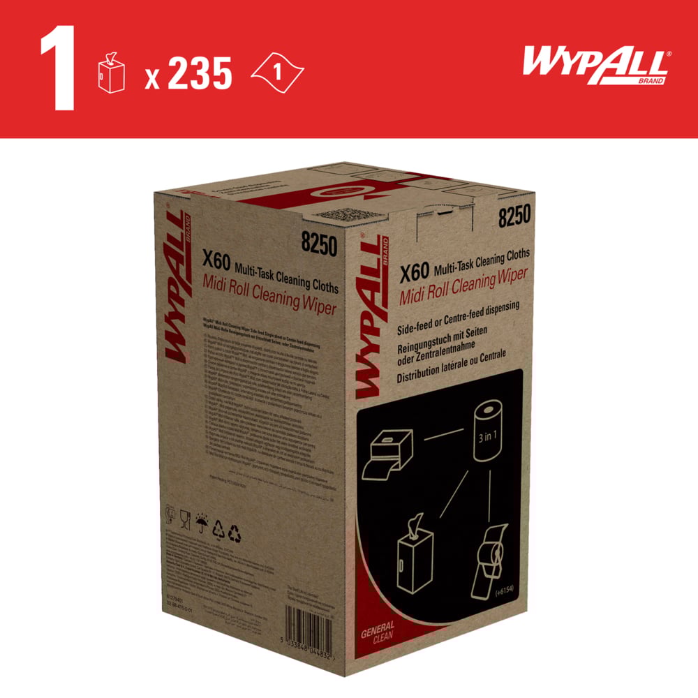 This is 2in1 Midi Roll Blue Wipes for Cleaning Carton of 235 31cm Repeat Use manufactured by WYPALL. The manufacturer part number is 8250. It is assigned with a trade name of 2in1 midi roll. It is designed for repeat use . It has a decent blue colour. Applications Information involves cleaning. The package is a sort of carton. Its wiper is 31cm in size . It contains 235 wipes per pack . It is tailored with breathable, disposable, lightweight cloth features .