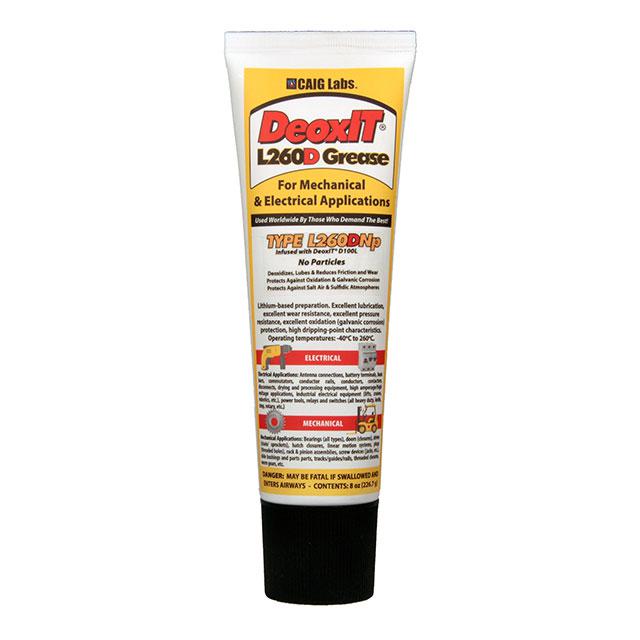 This is manufactured by CAIG Laboratories, Inc.. The manufacturer part number is L260-DN8. It is assigned with possible HTSUS value of 3403.19.5000. The product is rohs3 compliant. The product is highly reliable with a long-lasting period of 60 months. It comes in lithium grease configuration. The product is designed as a nice tube, 7.972 oz (226g). In addition, it is reach unaffected. Its warranty starts from date of manufacture. It offers storage features at 59°f ~ 95°f (15°c ~ 35°c). It is shipped in tube package . Its typical moisture sensitivity level is 1 (unlimited). It has a long 5 weeks standard lead time. The splendid features of the product include lubricant. It has a classic amber colour. The product deoxit®, is a highly preferred choice for users. Moreover, it corresponds to l260, a base product number of the product. The product is designated with the ear99 code number.