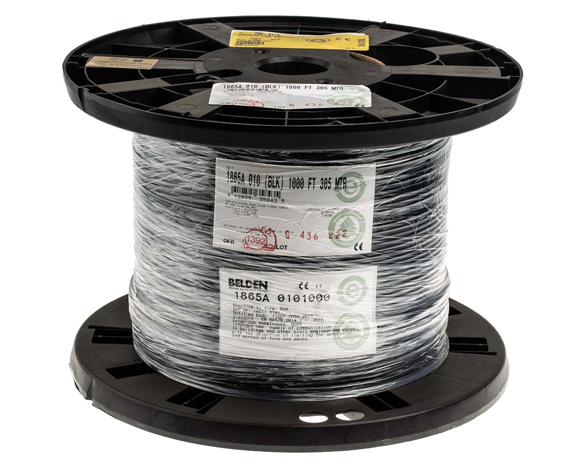 This is Black RG59/U Coaxial Cable Polyvinyl Chloride PVC Sheath 304m 75 Ω manufactured by Belden. The manufacturer part number is 1865A 0101000. It provides a 16.5pf/ft of capacitance value. Termination Options -unterminated. Its outer diameter is 3.81mm. Its attenuation is about 17 db/100ft @ 1500mhz, 19.6 db/100ft @ 2ghz, 20.8 db/100ft @ 2250mhz, 24 db/100ft @ 3ghz . Additionally, it contains 19 strands. The product complies with all safety standards, such as euroclass eca. The product has -30 → +75 °c of operating temperature range. The core strands are 19/37. It has a stranded type conductor strand . It has a maximum operating temperature of +75°c. Its velocity ratio is 82% . Moreover, the product has a nominal 300 v voltage rating. Its accurate length is 304m. It has a/an rg59/u type coaxial . The typical characteristic impedance includes 75 ω. The sheath is constructed from durable and adorable polyvinyl chloride pvc material. The conductor is made from bare copper material. The product 1865a, is a highly preferred choice for users. The strand size includes 37 awg. The sheath has an adorable black colour. Whereas, the minimum operating temperature of the product is -30°c. It has a robust foam hdpe insulation material.
