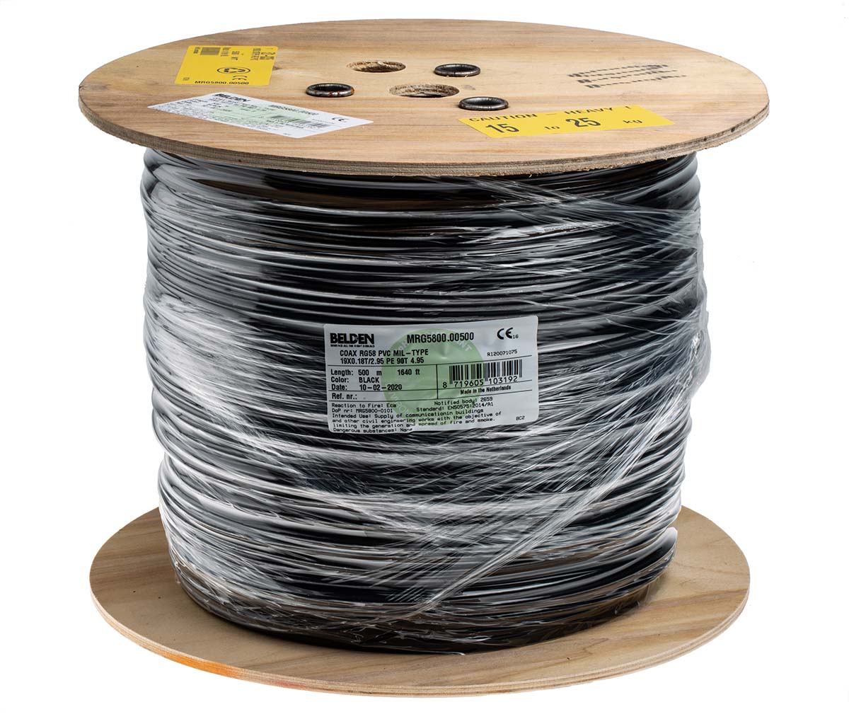 This is Black RG58C/U Coaxial Cable Polyvinyl Chloride PVC 500m manufactured by Belden. The manufacturer part number is RS_521-8335. The typical characteristic impedance includes 50ω. The product has 4.95 mm external diameter. The conductor is made from tin copper wire material. The product mrg5800, is a highly preferred choice for users. Whereas, the minimum operating temperature of the product is -40°c. The product has a iec 60332-1-2 (low smoke zero halogen) fire behaviour. The core strands are 19. Termination Options -unterminated. The integrated conductor is a stranded conductor. Features 21awg - American Wire Gauge. polyethylene is the jacket material of the product . It has a/an rg58 type coaxial . coaxial cable is a versatile product designed to provide user-defined applications. It has a maximum operating temperature of 85°c. Furthermore, the cable has a 500m of length.