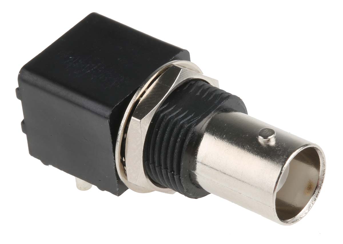 This is Right Angle 50Ω PCB Mount BNC Connector jack Solder Termination Nickel manufactured by RS Pro. The manufacturer part number is 526-5858. While providing normal polarity. The body is nickel plated for adorable look and strength. The product is available in pcb mount configuration. In addition, female is the available "Gender" of the product. It has right angle body orientation. This coaxial connector is a type of bnc connector. It has a bulkhead yes . The high-quality gold is used as contact plating material. It allows through hole termination method. Furthermore, the product has 0 to 1ghz operating frequency range. It has an impedance value of 50ω. The product is made from sturdy phosphor bronze materials.
