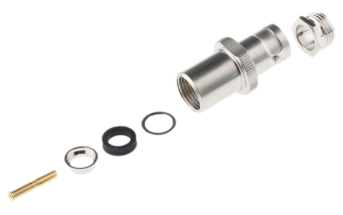 This is Straight 75Ω Cable Mount BNC Connector jack Clamp Termination RG59 B/U Nickel manufactured by Telegartner. The manufacturer part number is J01003A1227. The body is nickel plated for adorable look and strength. The product is available in cable mount configuration. In addition, female is the available "Gender" of the product. It has straight body orientation. It is a typical rg59 b/u cable. This coaxial connector is a type of bnc connector. The high-quality gold is used as contact plating material. It allows clamp termination method. Furthermore, the product has 0 to 4ghz operating frequency range. It has an impedance value of 75ω. It has a maximum operating temperature of +165°c. Whereas, the minimum operating temperature of the product is -65°c. The product is made from sturdy beryllium copper materials.