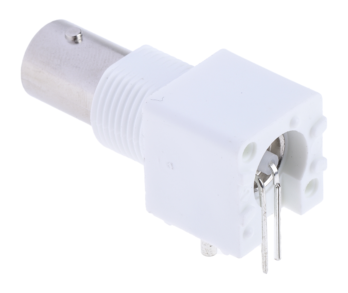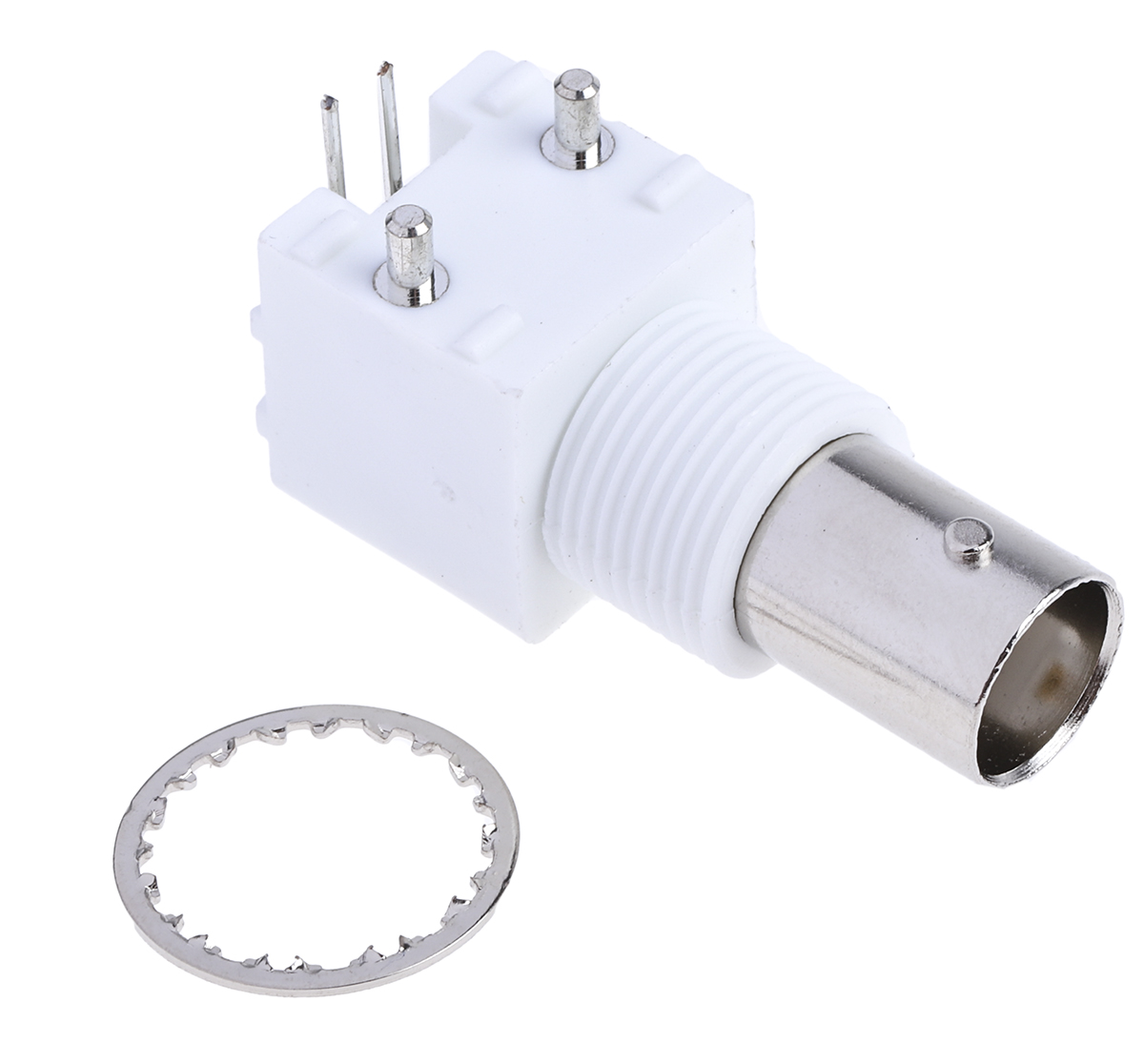 This is Right Angle 50Ω PCB Mount BNC Connector jack Nickel Solder Termination manufactured by RS Pro. The manufacturer part number is 526-5864. While providing normal polarity. The body is nickel plated for adorable look and strength. The product is available in pcb mount configuration. In addition, female is the available "Gender" of the product. It has right angle body orientation. This coaxial connector is a type of bnc connector. It has a bulkhead yes . The high-quality gold is used as contact plating material. It allows through hole termination method. Furthermore, the product has 0 to 1ghz operating frequency range. It has an impedance value of 50ω. The product is made from sturdy phosphor bronze materials.