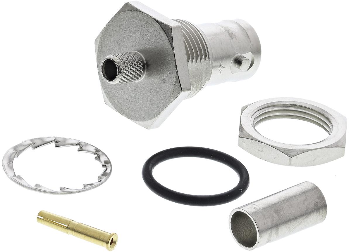 This is Straight 50Ω Panel Mount BNC Connector jack Nickel Crimp Termination RG58 C/U manufactured by Telegartner. The manufacturer part number is J01001A1379. The body is nickel plated for adorable look and strength. The product is available in panel mount configuration. In addition, female is the available "Gender" of the product. It has straight body orientation. It is a typical rg58 c/u cable. This coaxial connector is a type of bnc connector. It has a bulkhead yes . The high-quality gold is used as contact plating material. It allows crimp termination method. Furthermore, the product has 0 to 4ghz operating frequency range. It has an impedance value of 50ω. It has a maximum operating temperature of +165°c. Whereas, the minimum operating temperature of the product is -65°c. The product is made from sturdy beryllium copper materials.