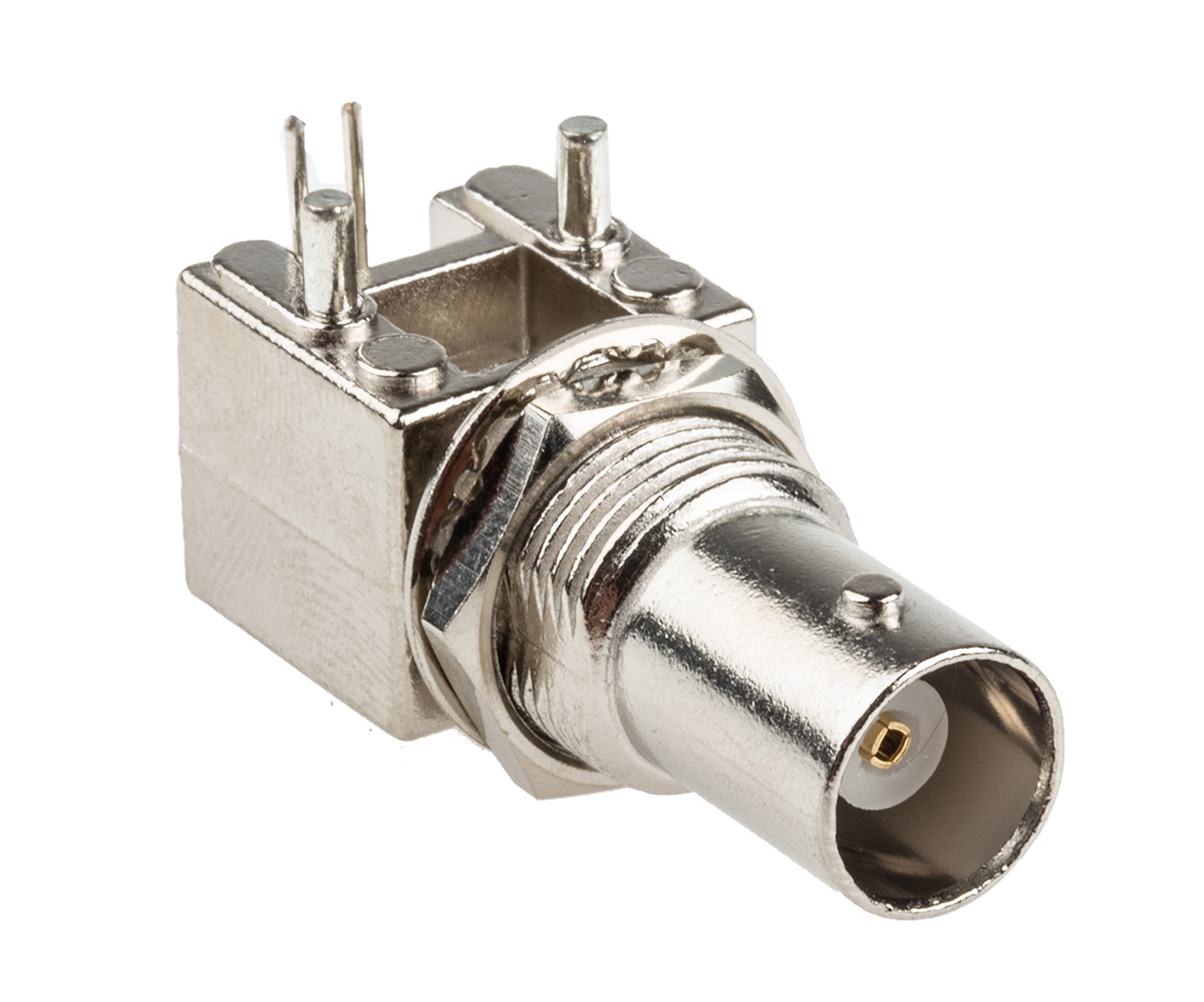 This is Right Angle 50Ω PCB Mount BNC Connector jack Nickel Solder Termination manufactured by RS Pro. The manufacturer part number is 546-5165. While providing normal polarity. The body is nickel plated for adorable look and strength. The product is available in pcb mount configuration. In addition, female is the available "Gender" of the product. It has right angle body orientation. This coaxial connector is a type of bnc connector. It has a bulkhead yes . The high-quality gold is used as contact plating material. It allows through hole termination method. Furthermore, the product has 0 to 1ghz operating frequency range. It has an impedance value of 50ω. The product is made from sturdy phosphor bronze materials.