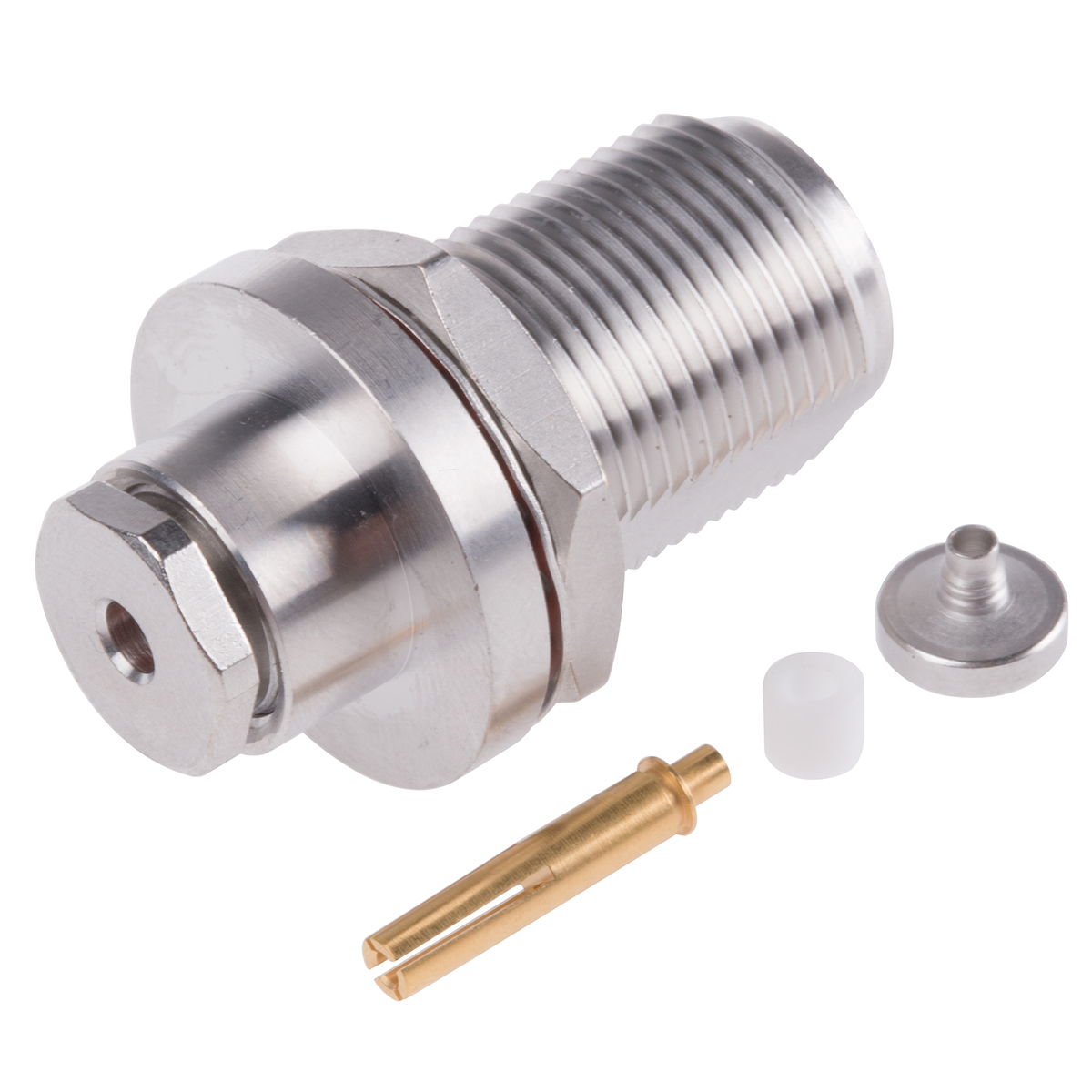 This is 50Ω Straight Panel Mount N Type Connector jack Clamp Termination 0 → 11GHz manufactured by Radiall. The manufacturer part number is R161322000W. The body is bronze plated for adorable look and strength. The product is available in panel mount configuration. In addition, female is the available "Gender" of the product. It has straight body orientation. It is a typical rg179, rg187, rg188, rg316 cable. It allows clamp termination method. This coaxial connector is a type of n connector. The high-quality gold over nickel is used as contact plating material. Furthermore, the product has 0 to 11ghz operating frequency range. It has an impedance value of 50ω. It has a maximum operating temperature of +155°c. Whereas, the minimum operating temperature of the product is -55°c. The product is made from sturdy beryllium copper materials.