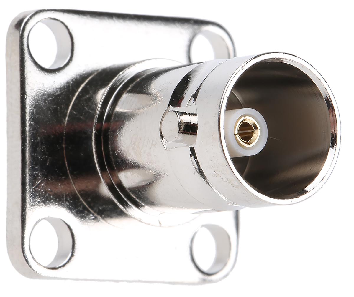 This is Straight 75Ω Panel Mount BNC Connector jack Nickel Solder Termination manufactured by RS Pro. The manufacturer part number is 546-4011. While providing normal polarity. The body is nickel plated for adorable look and strength. The product is available in flange mount configuration. In addition, female is the available "Gender" of the product. It has straight body orientation. This coaxial connector is a type of bnc connector. It has a bulkhead yes . The high-quality gold is used as contact plating material. It allows solder termination method. Furthermore, the product has 1ghz operating frequency range. It has an impedance value of 75ω. The product is made from sturdy brass materials.