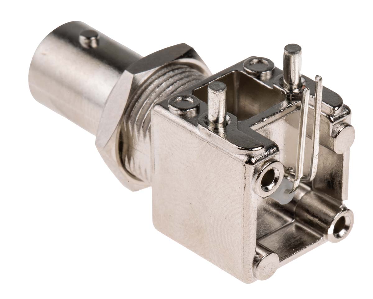 This is Right Angle 50Ω PCB Mount BNC Connector jack Nickel Solder Termination manufactured by RS Pro. The manufacturer part number is 546-5137. While providing normal polarity. The body is nickel plated for adorable look and strength. The product is available in pcb mount configuration. In addition, female is the available "Gender" of the product. It has right angle body orientation. This coaxial connector is a type of bnc connector. It has a bulkhead yes . The high-quality gold is used as contact plating material. It allows through hole termination method. Furthermore, the product has 0 to 1ghz operating frequency range. It has an impedance value of 50ω. The product is made from sturdy phosphor bronze materials.