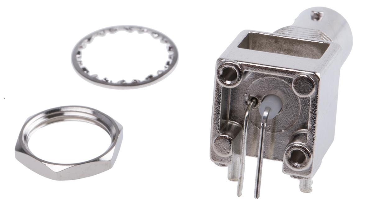 This is Right Angle 75Ω PCB Mount BNC Connector jack Nickel Solder Termination manufactured by RS Pro. The manufacturer part number is 546-5143. While providing normal polarity. The body is nickel plated for adorable look and strength. The product is available in pcb mount configuration. In addition, female is the available "Gender" of the product. It has right angle body orientation. This coaxial connector is a type of bnc connector. It has a bulkhead yes . The high-quality gold is used as contact plating material. It allows through hole termination method. Furthermore, the product has 0 to 1ghz operating frequency range. It has an impedance value of 75ω. The product is made from sturdy phosphor bronze materials.
