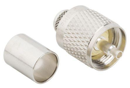 This is Straight standard Cable Mount UHF Connector Crimp Termination manufactured by Amphenol. The manufacturer part number is 083-8SP-RFX. The body is nickel plated for adorable look and strength. The product is available in cable mount configuration. In addition, male is the available "Gender" of the product. It has straight body orientation. It is a typical rg-213, rg-214, rg-225, rg-302, rg-393, rg-8, rg-87, rg-8a, rg-9, rg-9a, rg-9b cable. This coaxial connector is a type of uhf connector. The high-quality silver is used as contact plating material. It allows crimp termination method. Furthermore, the product has 0.3ghz operating frequency range. The product is made from sturdy brass materials. It has a maximum operating temperature of +165°c. Whereas, the minimum operating temperature of the product is -65°c. The product is available in standard size.